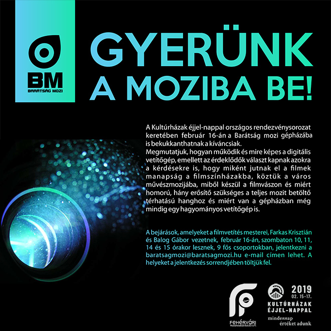 Megmutatjuk, hogyan működik és mire képes a digitális vetítőgép, emellett az érdeklődők megtudhatják, hogy miként jutnak el a filmek manapság a filmszínházakba, köztük a város művészmozijába, miből készül a filmvászon és miért homorú, hány erősítő szükséges a teljes mozit betöltő térhatású hanghoz és miért van a gépházban még mindig egy hagyományos vetítőgép is. Farkas Krisztián és Balog Gábor vezetik az érdeklődőket, 10 órától óránként.