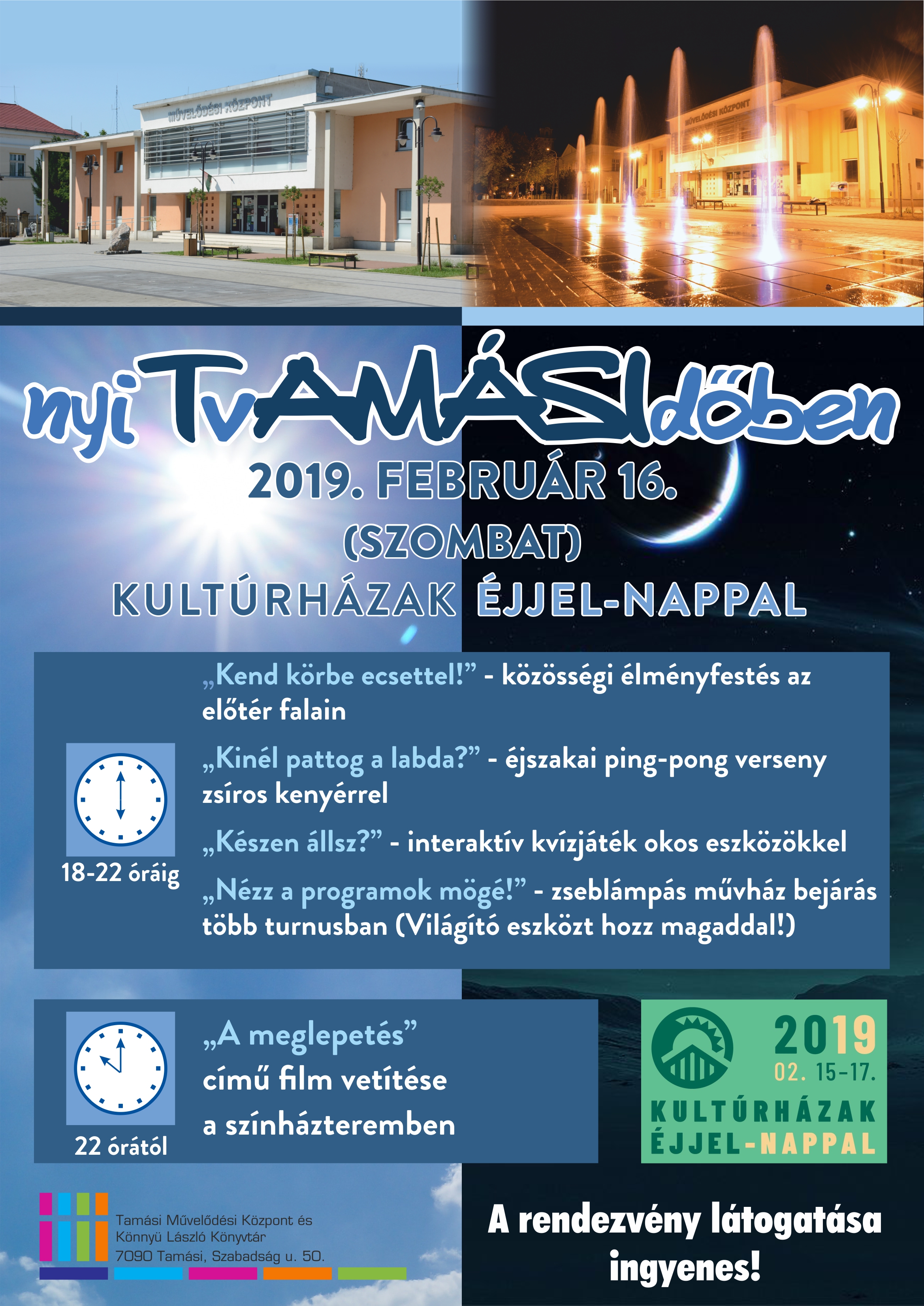 Éjszakai közösségi programra várják a szervezők az érdeklődőket a Tamási Művelődési Központban. A rendezvényen a képzőművészet, a film, a vetélkedés, a sport is szerepet kap. Akik a festéshez éreznek kedvet, azok az intézmény teljes aulájának falait dekorálhatják körbe, a sportjátékok kedvelői pingpongozhatnak, a vállalkozó kedvűek lemérhetik tudásukat az interaktív kvízjáték során, a mozi szerelmesei filmvetítésen vehetnek részt, miközben a ház rejtett zugait is felfedezhetik közösen.