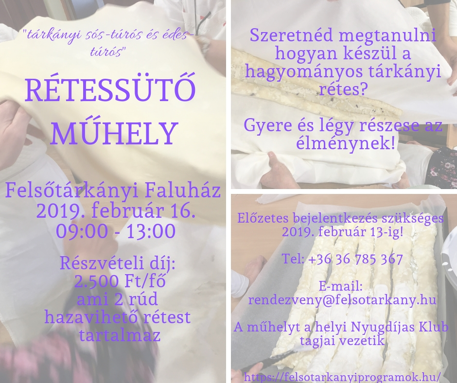 A résztvevők elsajátíthatják a hagyományos tárkányi házi rétes készítésének minden mozzanatát, és a mini-tanfolyam végére gazdagabbak lesznek egy-egy rúd sós és édes túrós saját készítésű rétessel. A műhelyt, a helyi Nyugdíjas Klub tagjai vezetik.