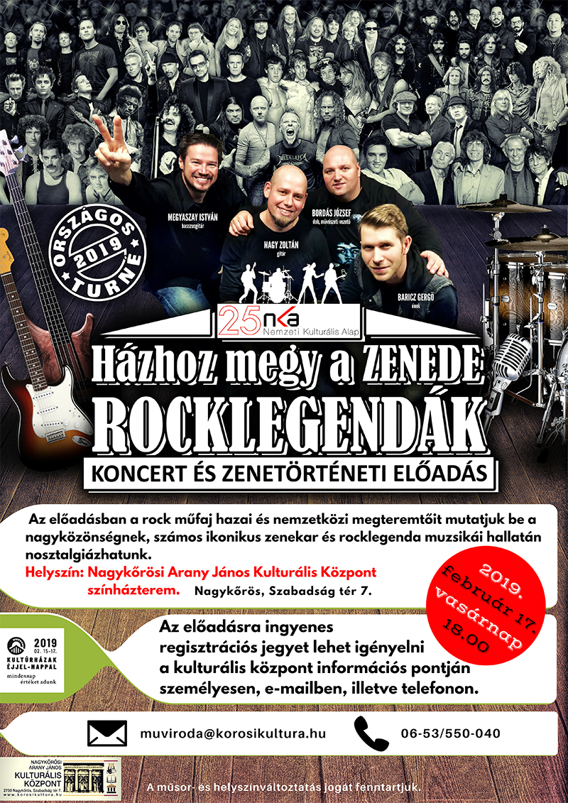 Az előadásban a rock műfaj hazai és nemzetközi megteremtőit mutatjuk be a nagyközönségnek, számos ikonikus zenekar és rocklegenda muzsikái hallatán nosztalgiázhatunk. Az előadásra ingyenes regisztrációs jegyet lehet igényelni a kulturális központ információs pontján, e-mailben: muviroda@korosikultura.hu, illetve telefonon: 06-53/550-040.
